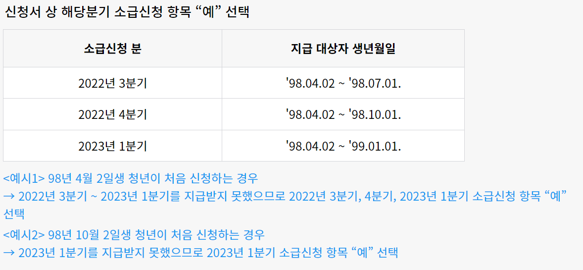 신청 시 23년 4.1일 기준 24 세 신청 자에 한해서 지난 분기 미선청분 추가 신청 가능하니 이 부분 꼭 확인해 주시기 바랍니다.